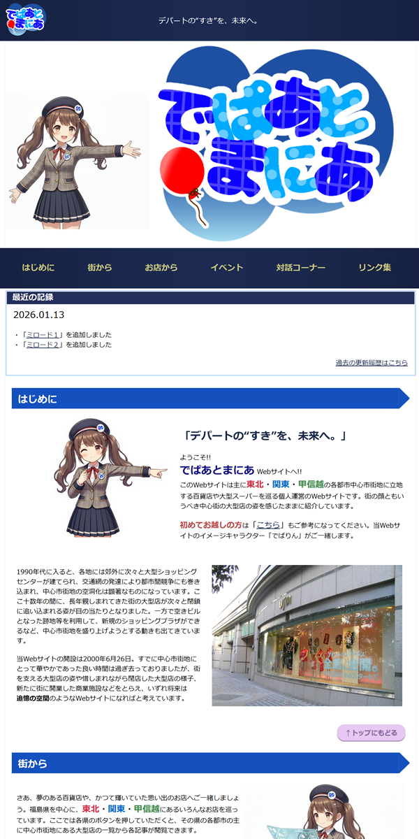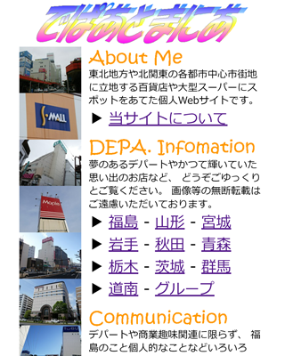 2000年6月26日に産声をあげた当Webサイト、「でぱあとまにあ」。テキストベースのトップページに、最初は「中合」と「長崎屋福島店撤退」の2項目のみの 非常にシンプルな作りでした。その後、福島市の項目が増えていき、「CARACARO」や「福島の七夕」なども 掲載、やがて郡山市やいわき市などの項目も追加されていきました。