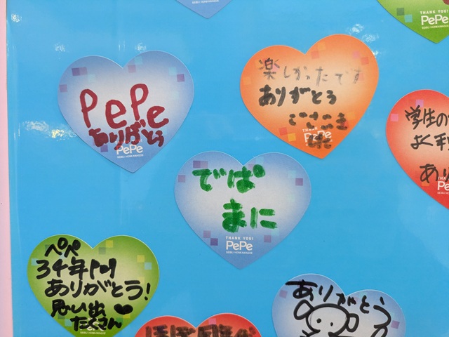 吹き抜けの下、地階エスカレーターフロア(ペペプラザというのか)には、感謝メッセージのコーナーが。近隣の川越市立川越第一小学校、同川越中学校のみなさんからのメッセージが掲示されていた。