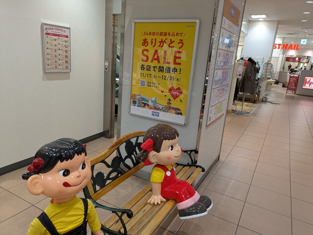 不二家のペコちゃん。本川越ペペの営業を知ってか知らずか、呑気にベンチに座っている。