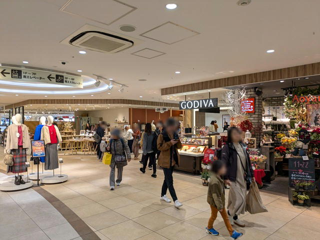 JR茅ヶ崎駅の改札階にあるラスカ茅ヶ崎店舗入口。改札から出てきた買い物客が続々と店に入っていく。