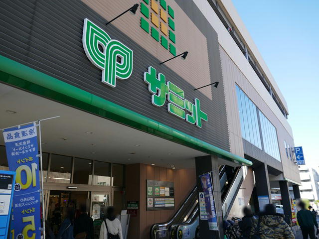 建屋は1階にスーパーマーケットのサミット入口。外側のエスカレーターを使って2階フロアへ向かう構造になっている。