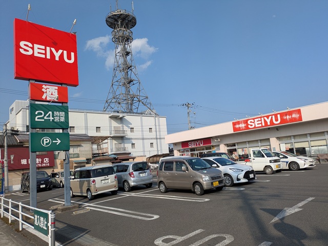「SEIYU」の看板には、エンドーチェーンのロゴ跡がみえている。エンドーチェーン保原店時代の画像は当コンテンツ最下部を参照。