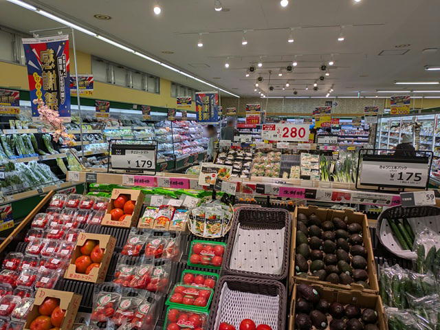 新鮮な青果物など並ぶエントランスからの奥行き。24時時間営業、いつも商品を絶やさない努力は大変だろう。