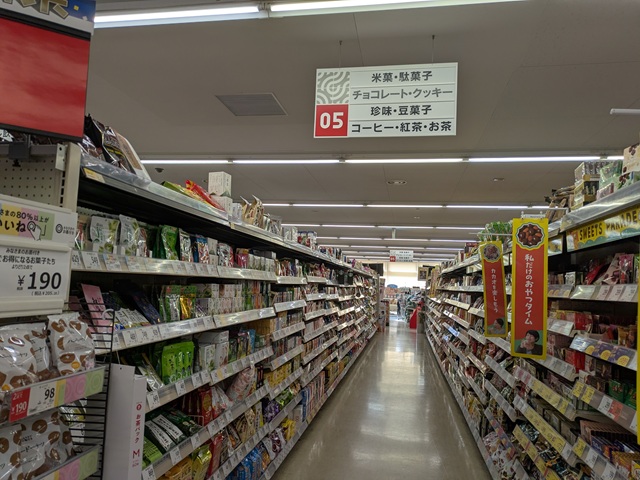 両側に長い商品棚が並ぶ店舗中央部。ほしい調味料、珍しいお菓子がきっと見つかる。