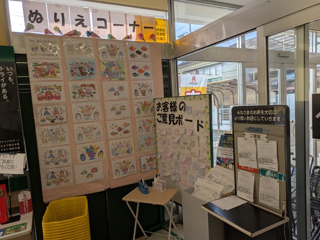 レジを過ぎて出口動線には、「ぬりえコーナー」やご意見ボードなど。