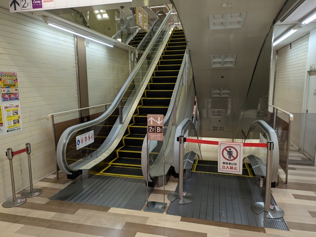 1階から2階までは階段またはエレベーターであがることになる。2階からはエスカレーターが稼働している。1階のロピア部分の改装の関係だろうか。
