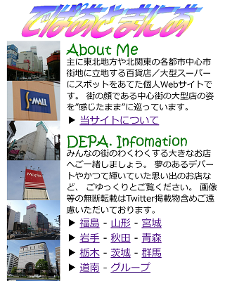 2000年6月26日に産声をあげた当Webサイト、「でぱあとまにあ」。テキストベースのトップページに、最初は「中合」と「長崎屋福島店撤退」の2項目のみの 非常にシンプルな作りでした。その後、福島市の項目が増えていき、「CARACARO」や「福島の七夕」なども 掲載、やがて郡山市やいわき市などの項目も追加されていきました。