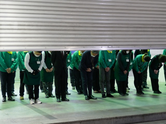 最後のシャッターが閉じられるなか、深々と頭を下げる伊藤社長。回りに集まった買い物客からは拍手が沸き起こった。