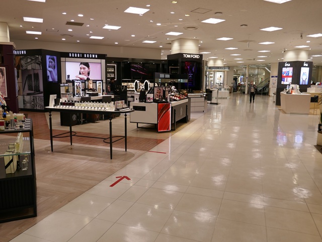 1階は百貨店の定番、コスメや婦人雑貨のフロア。煌びやかな化粧品店が百貨店のエントランスを演出している。1階に併設されているスターバックスコーヒーは07:30 - 22:00の営業である。