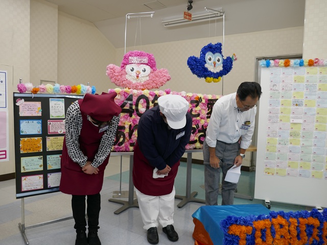 2回目、最後の挨拶が終了し、深々と買い物客に礼をする店長たち。