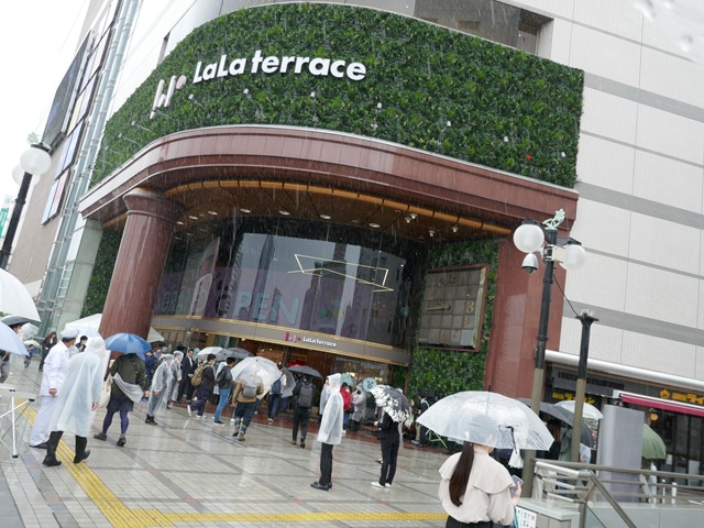 ららテラス川口正面口。オープン当日は10:00開店の予定だったが、すでに9時台に買い物客が入場していた。おそらく、大雨でオープニングセレモニーなどを早めて実施し、少しでも早く雨の中で並ぶ買い物客を館内に導いたのであろう。