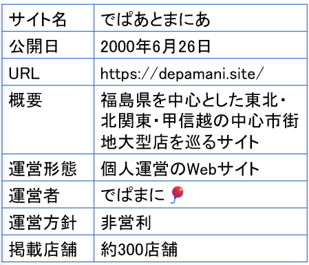 このWebサイト(depamani.site)は個人が趣味として作成したものであり、掲載されている会社・組織等とは関係がありません。当サイト内の各ページに掲載されている内容に関するお問い合わせは当サイトの運営者までお願いします。