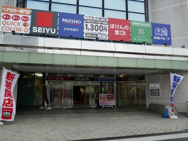 リボンとりでは、JRおよび関東鉄道取手駅の西口を出て橋上で直結されている再開発ビルです。塔屋を見るとSEIYUの巨艦店舗に見えますが、SEIYUは1階のみに入居。2階の遊興施設(パチンコ屋)とともに、キーテナントとなっている。
