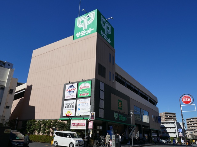 建屋は1階にスーパーマーケットのサミット入口。外側のエスカレーターを使って2階フロアへ向かう構造になっている。