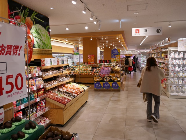 1階は食料品のフロア。惣菜・牛乳・たまご・飲料・酒・冷凍食品・パンなどが並ぶ。