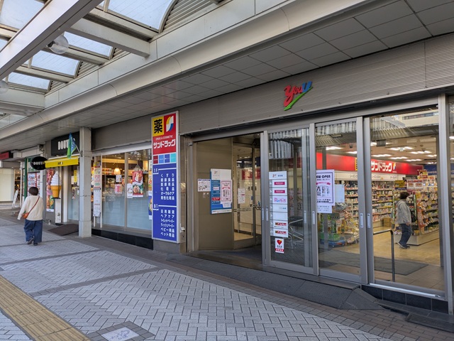 ユーユー梅屋駅前館の入口はこちら。サンドラッグがいきなり営業しているフロアにはいることになる。