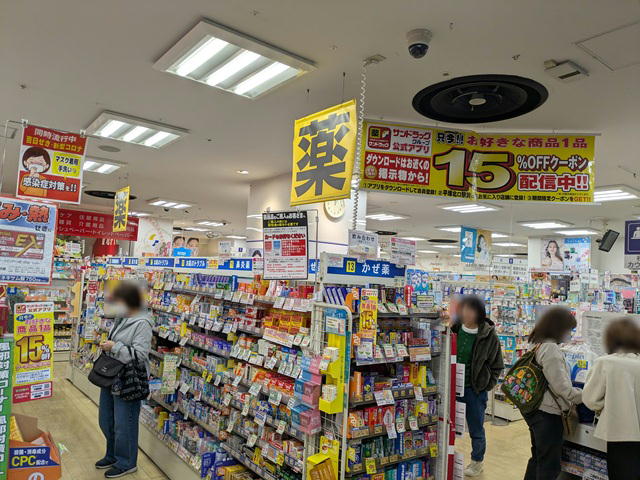 サンドラッグは地階と1階で営業。1階からの移動はエレベーターか階段で、エスカレーターは稼働していない。