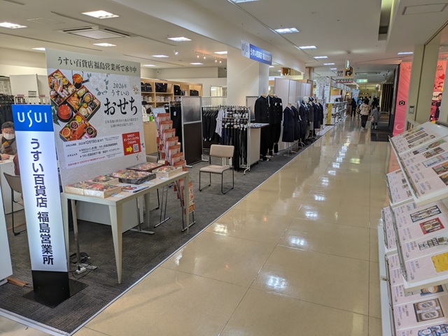MAXふくしま3階にある、うすい百貨店福島営業所。主な取り扱いは学生服と郡山のうすい百貨店とオンラインでつなぐコスメ販売など。また、郡山のうすい百貨店で購入した品物を、ここうすい百貨店福島営業所で受け取れるサービスもある。